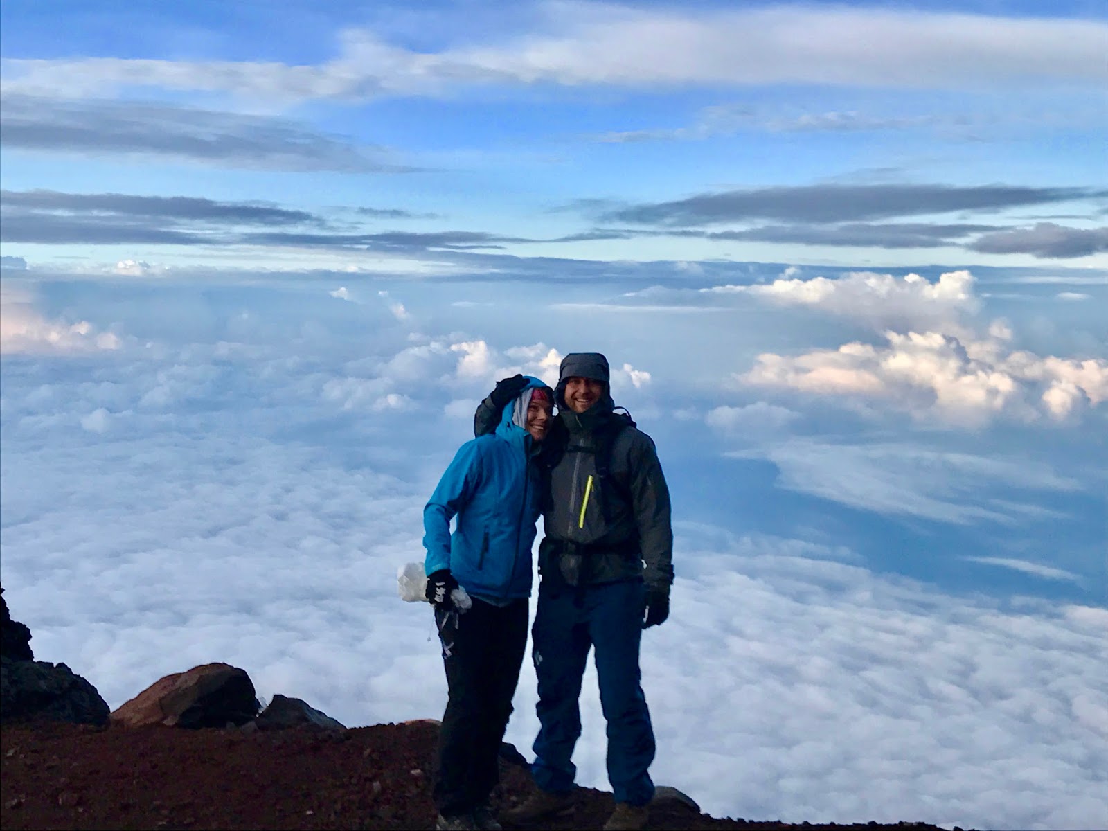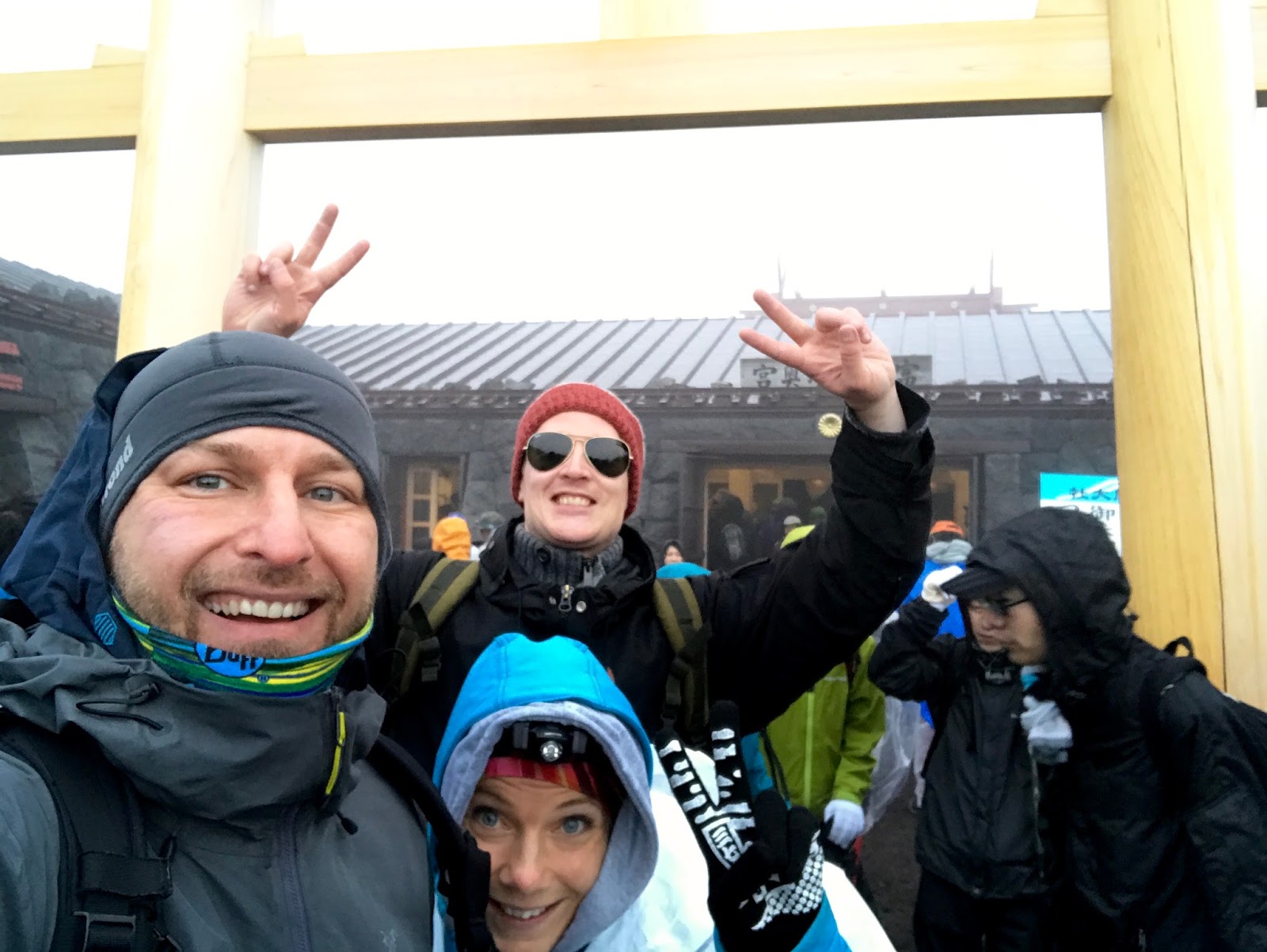 Niin me vastaanotimme nousevan päivän yhdessä satojen muiden ihmisten kanssa Fujin huipulla. Aamu oli niin sumuinen, ettemme kuvista kuuluisaa punaista auringonnousua nähneet. Kuitenkin pian auringon noustua taivas aukeni hiukan ja pääsimme nauttimaan häikäisevän kauniista maisemista.