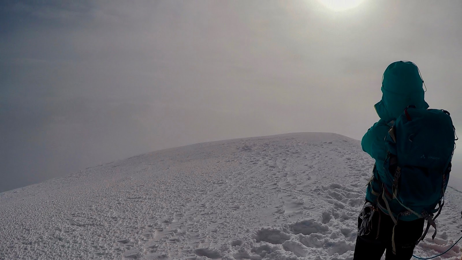 Huomasin meidän lähestyvän Gouteria oikeastaan lähinnä siitä, että korkeus alkoi taas imeytyä lihaksiin saaden ne pakottamaan ja anomaan armoa. Sää muuttui ensin vesitihkuksi ja pian lumisateeksi. Näkyvyys huononi nopeasti, mutta muuten olosuhteet olivat kohtuulliset. Takana alkoi olla pitkä päivä, oma lähestymispäivän korkeusmetriennätykseni (vaikka kuka niitä laskee, hahaaa), ja vatsassa mourusi nälkä, joka ei enää taintunut lakritsipaloilla. Nauroin hengästyneenä edelläni kiipeävälle Marcolle, että uusi lempisanani on: “Wait”, jonka kuulin yläpuoleltani säännöllisesti, kun oppaani kiipesi köydenmitan ylemmäs pysähtyäkseen sitten varmistamaan nousuni. Tuo pieni komento tarjosi aina lepohetken, joka oli välillä muutaman kymmenen sekunnin, parhaimmillaankin parin minuutin mittainen. Mutta se oli riittävästi, jotta lihakset ehtivät hiukan levähtää.