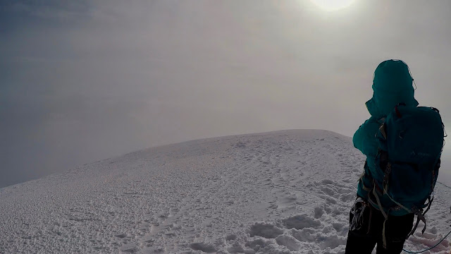 Huippujuhlat olivat iloiset mutta lyhyet. Olimme nimittäin taas pilven sisällä ja hyytävä viima kaivautui vaatteiden alle heti, kun pysähdyin. Iloisen halauskierroksen ja valokuvaussession jälkeen oli vuorossa pieni tankkaushetki ja sitten oli aika kääntyä paluumatkalle. Haikeasti katsoin harmaan pilvimassan sisään ja muistelin edellisen huiputukseni kirkasta maisemaa yli vuorien. En tuolloin arvannut palaavani tänne, ja nyt kun seisoin tässä, suuren vuoreni korkeimmalla kohdalla, tunteiden meri kuohui sisälläni.