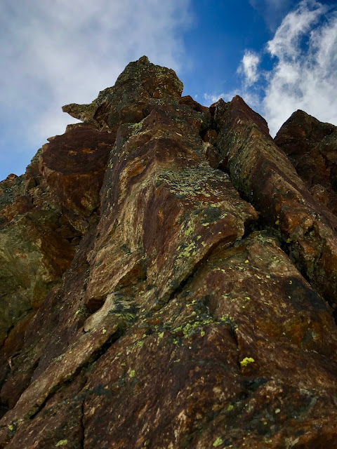 Pilvet kietoivat meidät tiukasti syliinsä, ja sää kylmeni pakkaslukemiin hetkessä. Navakka tuuli puhalsi sormet koppuroiksi ja kiiruhdin lisäämään lisäkerroksen hikisten vaatteiden päälle. Kuten yleensäkin, kivikkokiipeily oli hauskaa ja sai unohtamaan kaiken muun. Lumi ja jää olivat vallanneet myös ison osan kivikkoa. Jos en olisi oppinut luottamaan jäärautojen pitävyyteen, muutamassa kohdassa olisi saattanut jännittää ihan toden teolla. Oppaat kiipesivät edellä ja varmistivat meitä köysien avulla. Paikoitellen matkaa taitettiin nelinkontin ja etenemistä rytmitti jäärautojen ja hakkujen kilahtelu kiviä vasten. Olen aiemmin laskeutunut saman kivikon alas kesäaikaan, kun siellä ei ole lunta tai jäätä, ja jännittävä se oli silloinkin. Mutta nyt kadotin ajantajun täysin, niin kieli keskellä suuta ähersin eteenpäin.