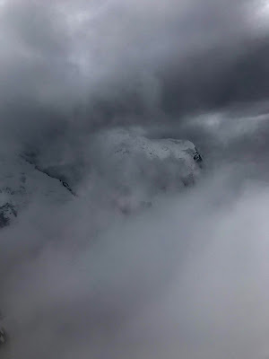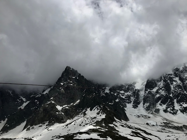 Odottamattoman lepopäivän käytimme nousemalla hissillä Aiguille du Midin huipulle (3842 m). Aikaa oli liian vähän, jotta noususta olisi ollut hyötyä akklimatisoitumisen näkökulmasta. Mutta en ollut aiemmin käynyt tuolla kuuluisalla huipulla, jonne yleensä Chamonix’iin saapuvat säntäävät ensimmäisenä, joten tartuin hanakasti tilaisuuteen päästä ihailemaan maisemia korkealta. Hissimatkan aikana maisema paljasti, että lunta oli todellakin paljon, ja saatoimme tässä kohtaa vain arvailla, mitä se tarkoittaisi kiipeämisellemme.