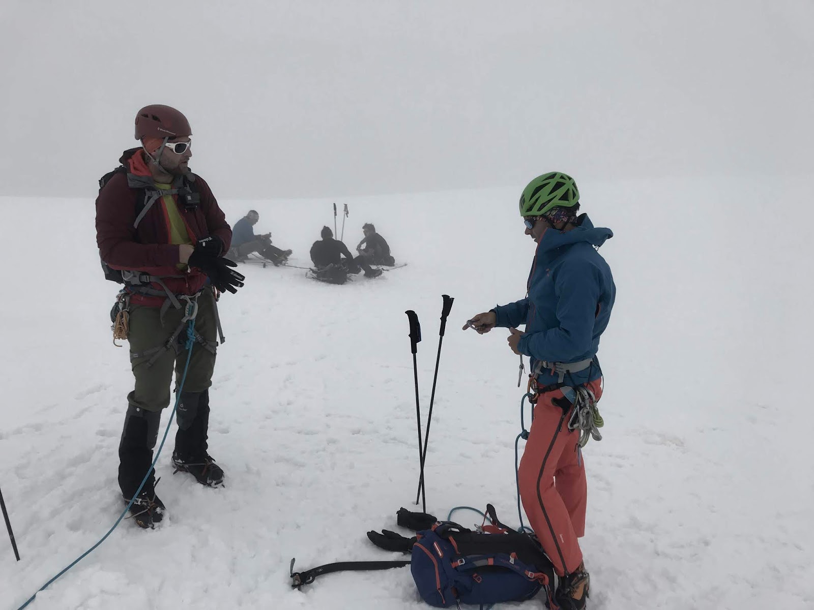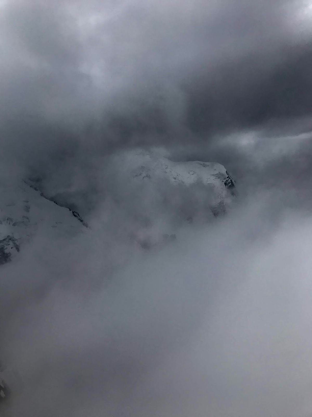 Aamupalalla salissa saimme todeta, että ulkoa kuuluva humina ei ollut pientä ropinaa, vaan viistosuuntaisena suihkuava vesisade oli jatkunut halki yön. Olimme onnistuneet osumaan viikon toistaiseksi ainoaan huiputusikkunaan, ja tänään huiputusta tavoittelevat ryhmät olivat saaneet osakseen saman karvaan kokemuksen kuin me vuonna 2016. He olivat jääneet majalle, ja osa oli nyt lepäämässä ja osa treenaamassa toiveenaan uusi yritys huomenna.