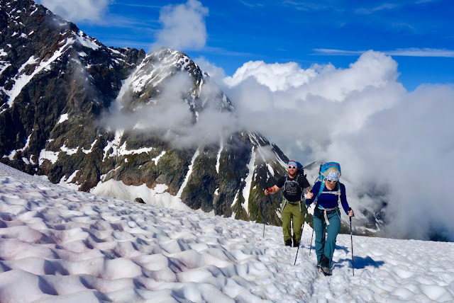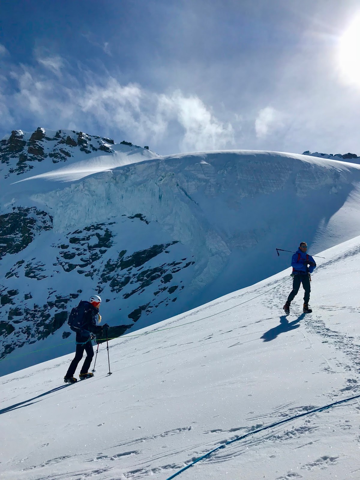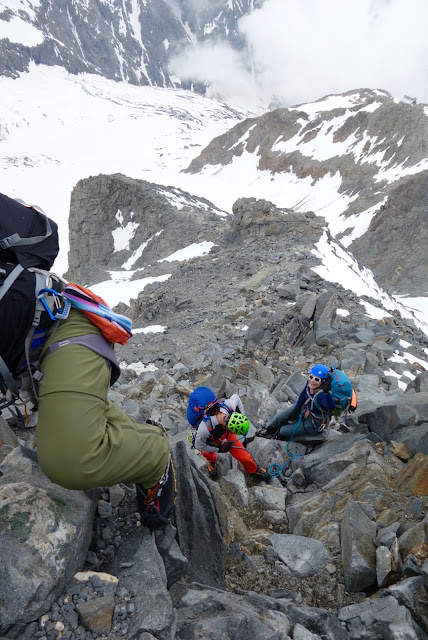 Matka jatkui nyt tukahduttavan kuumassa auringonpaisteessa. Jäätikölle saapuessamme saimme taas kokea, kuinka auringon kuumuus muuttaa lumen rautoihin liimautuvaksi massaksi. Hikisen ja jyrkän sohjorinteen jälkeen nousimme suuren kivikon juurelle ja kiinnityimme kahteen köysistöön, minä Marcon ja Heikki Fabrizion kanssa. Tiukan nousun aikana harjanteen poikki silloin tällöin suhahtava tuuli pyyhki kuumia poskiani ja viilensi hiukan. Mutta edelleen olin niin kuumissani, että aurinkolasien sisäpinta huurtui, ja pienellä juomatauolla Heikki rutisti hikeä noruvana vanana otsallaan olleesta buffista. Kivikossa oli niin hauska kiivetä, että hämmästyin, kun yhtäkkiä edessäni, vain pienen jäätikköosion takana oli Tete Roussen maja.