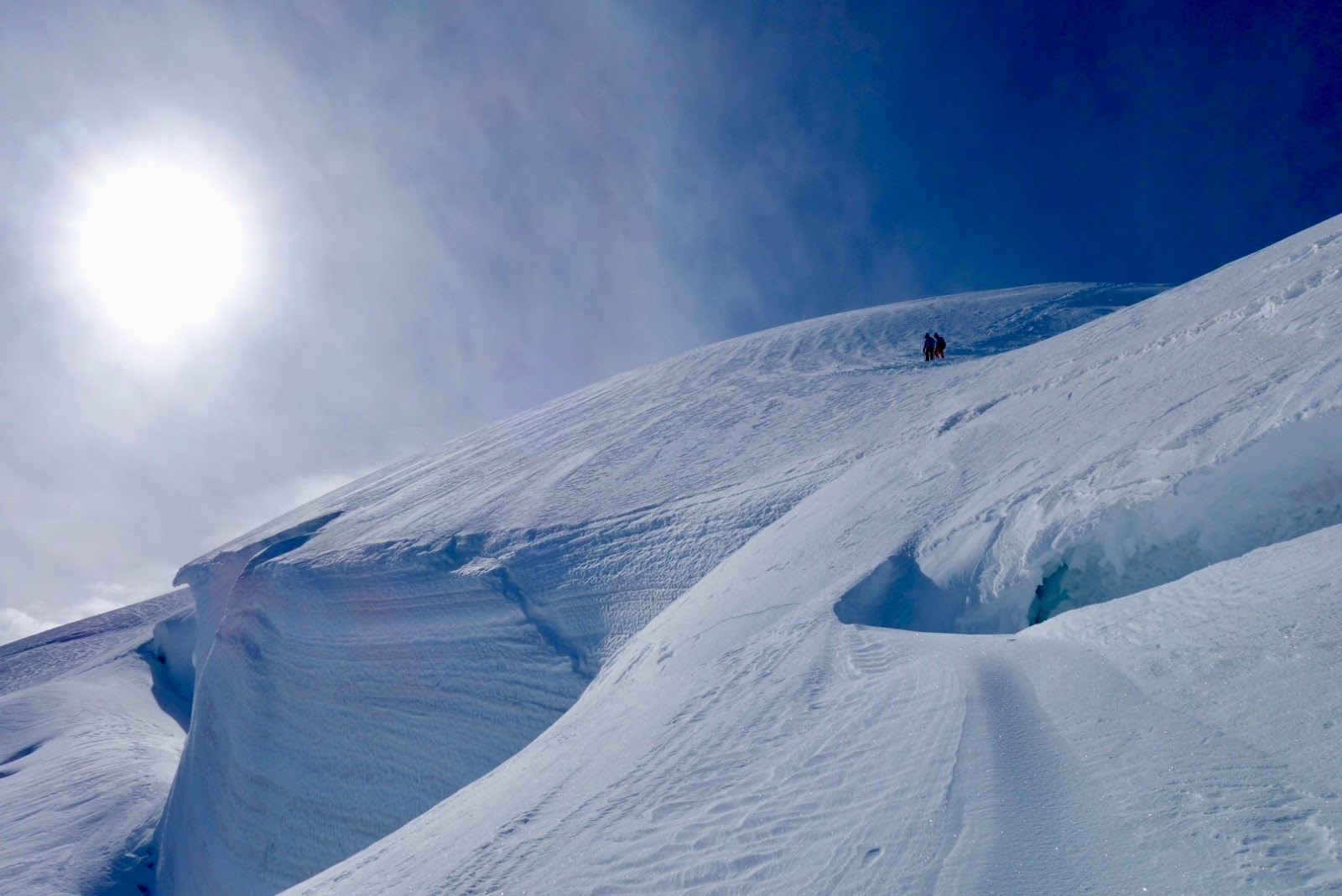Reitti huipulle oli edessä tuttuna mutta samaan aikaan uudenlaisena: lumisempana ja jäisempänä. Ensimmäinen jyrkkä nousu Ref. Vallot’lta näyttää siltä kuin se johtaisi suoraan huipulle. Vasta ensimmäisen harjanteen huipulle nousu paljastaa reitin todelliset kasvot. Nimittäin harjanteita on peräkkäin useita, ja niiden välissä sukelletaan alemmas syvennykseen. Jokaisen harjanteen toivoo olevan se viimeinen, mutta uusia pykälöitä tuntuu ilmestyvän ihan loputtomiin. Koko matka kuljetaan tuulille altistuneena harjanteella, joka on välillä vain alle metrin levyinen, ja molemmilla puolilla on pitkät pudotukset. Vaikka vuorottelevat nousut ja laskut eivät vaadi teknistä osaamista, ovat ne raskaita – varsinkin syvemmässä lumessa – ja vaativat varmajalkaisuutta, sillä pienikin horjahdus tai uupunut harha-askel voi synnyttää ikäviä seuraamuksia.