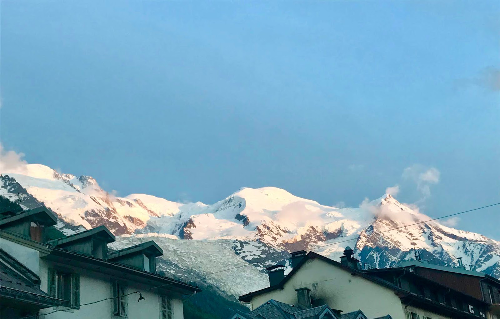 Vuoret kylän ympärillä kaartuivat yläpuolellamme kuin suojaava metsä. Muutamat iltaisen auringon valossa hehkuvat pilvet sivelivät sinistä taivasta vasten työntyviä huippuja. Kaikkein kaukaisimpana Mont Blanc kurkisti varovasti pehmeiden pilvien lomasta, punastui sitten ilta-auringossa kuin olisi huomannut katseemme – ja piilotti jälleen valkean huippunsa pumpulimaisen verhon taakse. Uskomatonta, että olimme täällä!