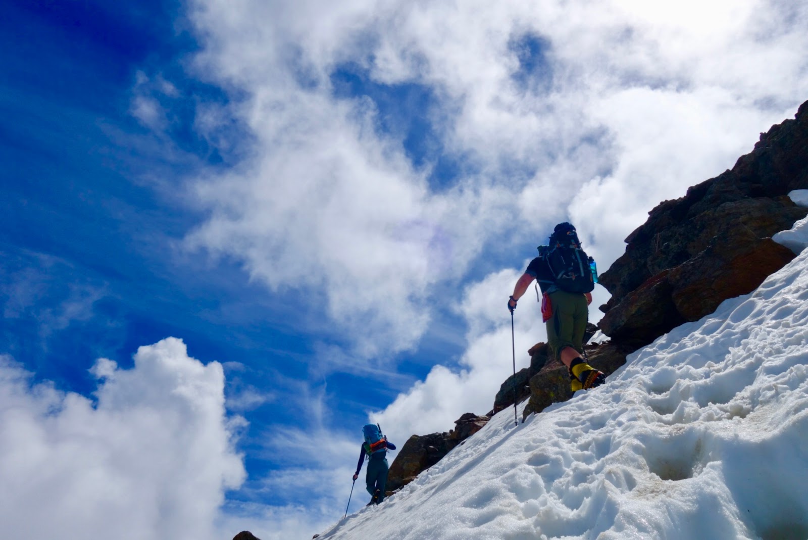 Parin tunnin kuluttua aloin hengästyä. Olimme kiivenneet pysähtymättä, ja olin keskittynyt vain etenemiseen. Jalkani olivat jo vähän aiemmin alkaneet antaa merkkejä lihaksiin valuvista hapoista, joten olin pyrkinyt muuttamaan askellustekniikkaa säännöllisin väliajoin antaakseni lihaksistolle vaihtelua ja lepoa. Sen sijaan, että olisin etsinyt oman vauhtini, olinkin ajokoiramaisesti lähtenyt seuraamaan Marcoa. Ja jos yksi asia matkan varrella on opittu, niin se on, että asiakkaan tulee ilmaista toivomansa tahti ja opas sopeuttaa menonsa siihen. Jos taas painelet täysillä oppaan perään miettimättä omaa jaksamistasi, opas helposti tulkitsee sinun toivovan nopeaa etenemistä ja saattaa jopa kiristää tahtia entisestään.