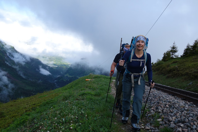 Lähestymispäivään liittyi eräs aivan erityinen kokemus: Koska kiipeilykausi ei ollut vielä alkanut, kiipeilijät ylemmäs rinteelle vievä vuoristojuna oli vielä suljettu. Normaalin junakyydin sijasta vaeltaisimme ensimmäiset 1000 vertikaalimetriä pitkin vuoristojunan raiteita. Tämä sai Heikin ja minut hyrisemään ilosta, sillä paitsi että se on ainutlaatuisen hieno kokemus, kiipeäisimme taas vuoren aidosti laaksosta laaksoon sen sijaan, että nousisimme junalla noin 2900 metriin.