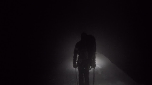 Yö oli pimeä ja sumuinen, joten keskityin vain lumen rouskeeseen jäärautojen alla ja öisen tuulen kuiskausten kuunteluun. Reitti kulki jälleen rinnettä suoraan ylös. En aluksi juurikaan kiinnittänyt huomiota tahtiimme, seurasinpahan vain Marcon edessä kulkevaa, otsalampun valossa sumuun piirtyvää silhuettia. Lunta oli paljon kuten muuallakin, mutta yön pakkanen oli jäädyttänyt sen kovaksi, ja kävely tuntui sujuvan mukavasti.