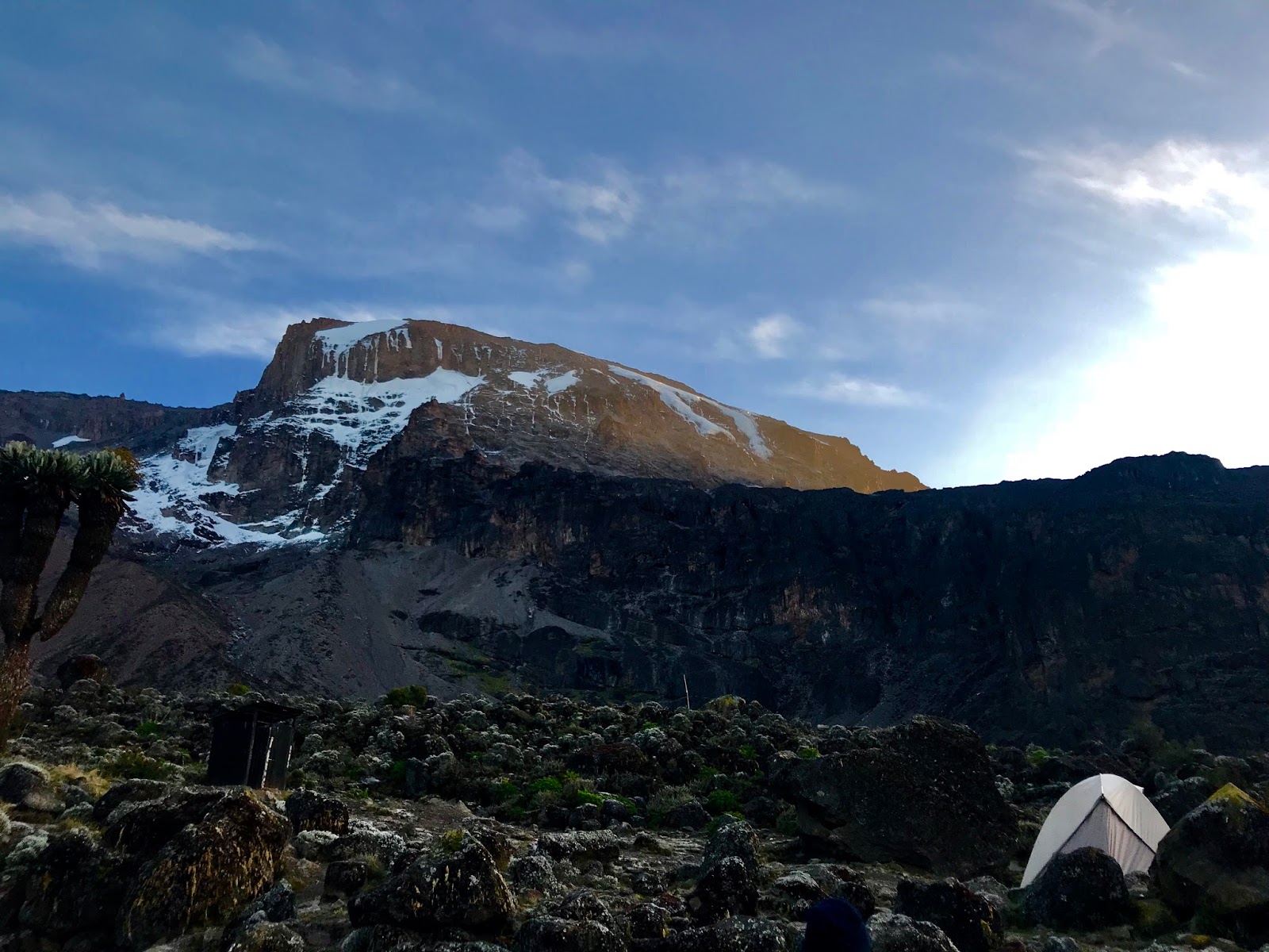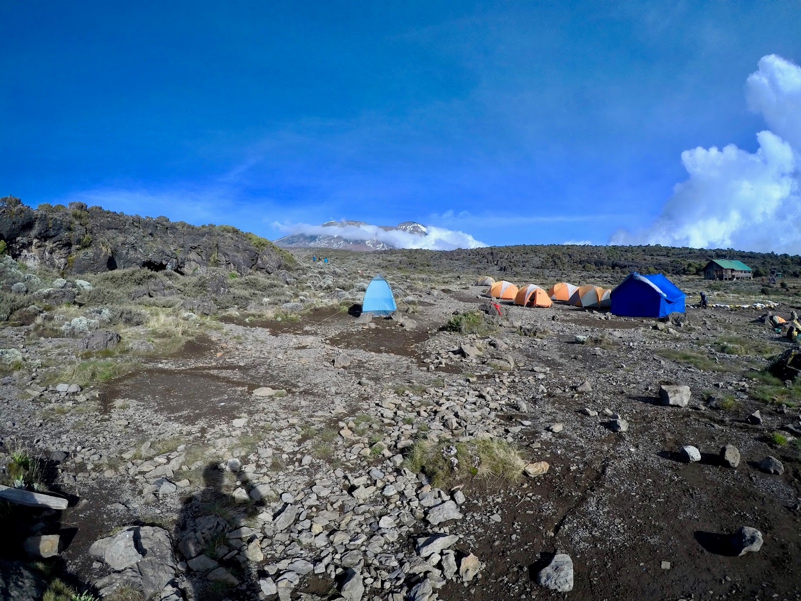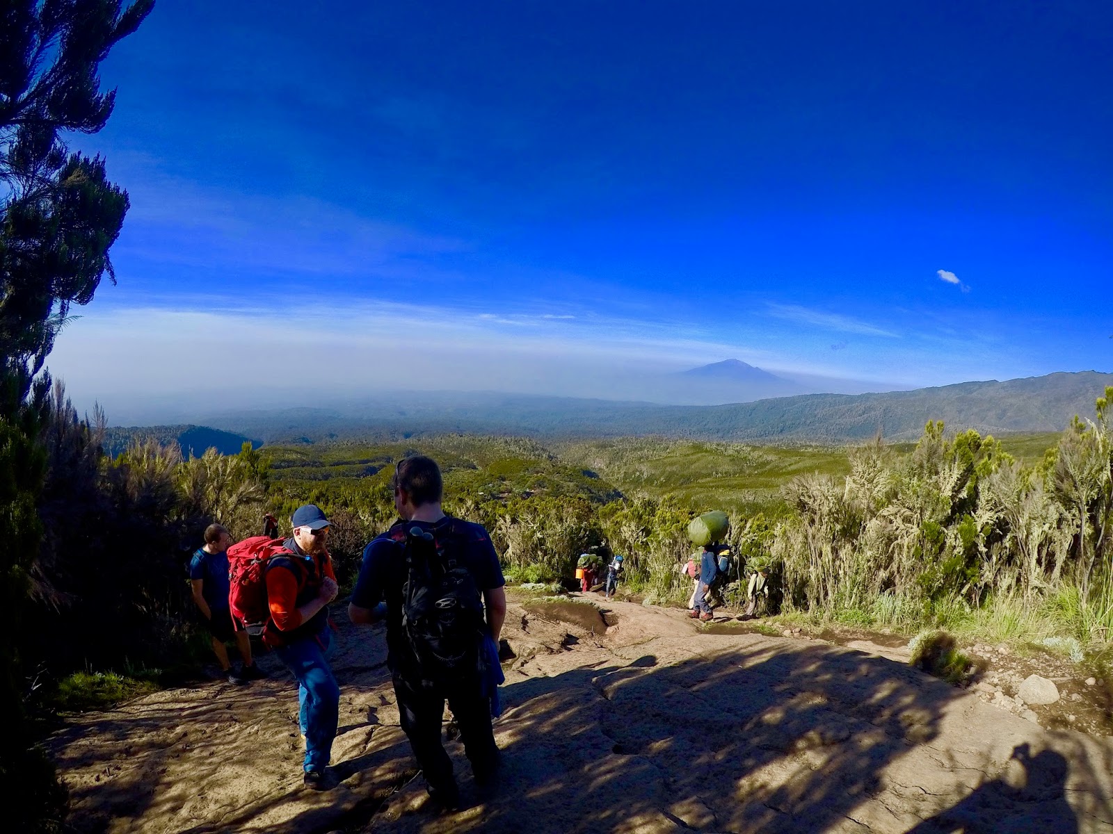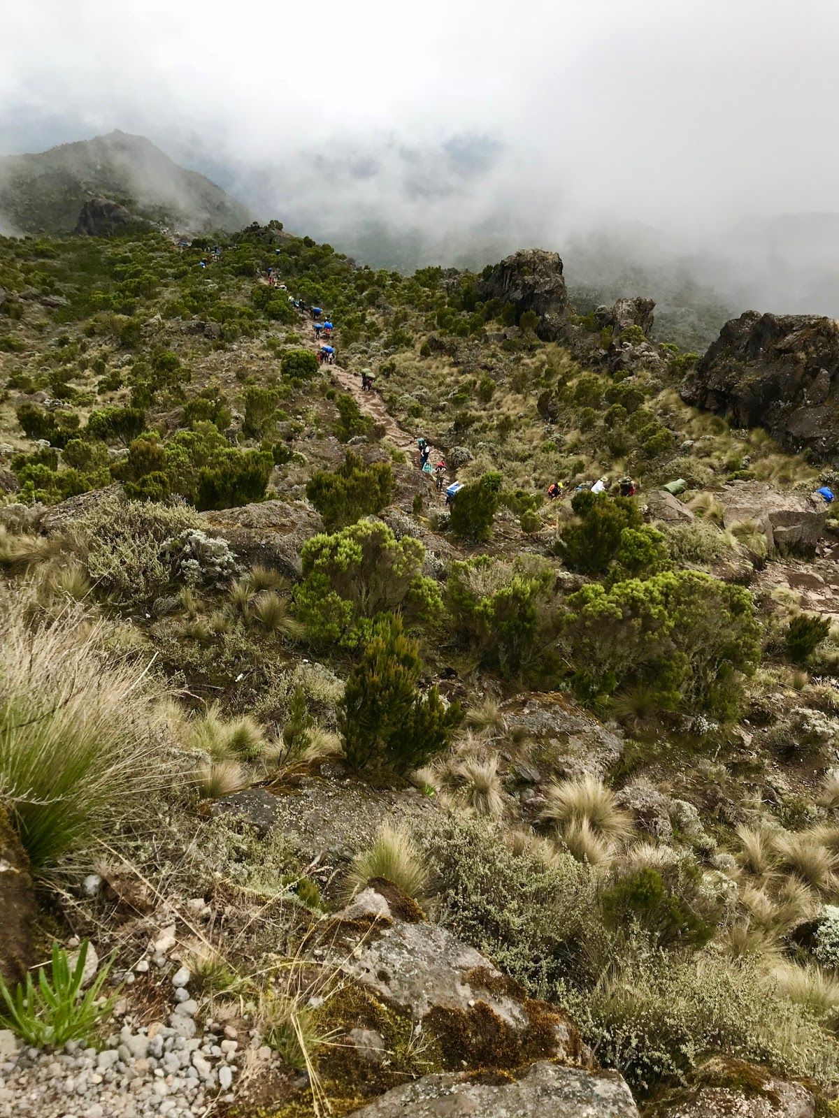 Parin tunnin mittainen traverse vuoren rinteen poikki kääntyi laskuun, kun aurinko puhkoi säteillään pilvipeiton, ja harmaa maisema vaihtoi taas asua. Kivestä näytti löytyvän punertava sävy, joka syttyi valon kosketuksesta. Erämaa muuttui lämpimän kutsuvaksi, ja kivet näyttivät suorastaan pehmeiltä. Uhuru Peak -huippu vartio kaukana vasemmalla kulkuamme, kun reittimme sukelsi harjanteelta notkelmaan, jossa punaisen kallion ja hietikon lomassa, tuulilta suojassa, kasvoi vihreää ruohoa, kaktuksia ja jopa pieniä keltaisia kukkasia. Kivisten rinteiden välisessä notkelmassa lämpötila nousi nautinnolliseksi.