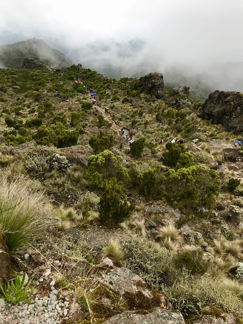Olin hyvällä tuulella ja vointini oli parempi kuin kertaakaan Kilimanjarolle lähdön jälkeen. Tosin en ollut syönyt aamiaisella juuri mitään. Tankkaamalla jatkuvasti urheilujuomaa koetin ylläpitää nesteytystä ja energioita. Osalla ryhmästä nousu alkoi selvästi tuntua; Paul voi huonosti ja hetken kuluttua myös Adam alkoi jäädä jälkeen.