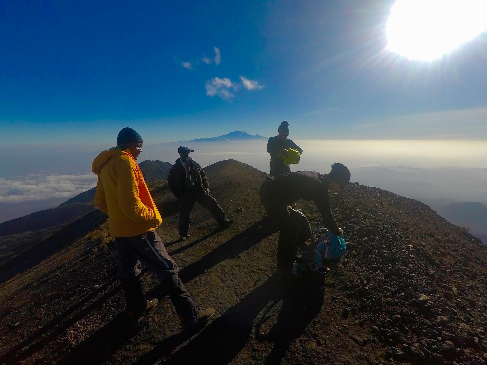 Olimme taas ensimmäisten joukossa, kun aikaisen aamiaisen jälkeen muodostimme jonon kiviselle rinteelle. Matka kohti Lava Toweria (4600 m) alkoi halki karun harmaanruskean ylängön. Maisema levittäytyi allamme aina Mount Merulle asti. Taivas oli huikean sininen, ja edessämme siintävän Kilimanjaron korkeimman kohdan, Uhuru Peakin, valkoinen laki säkenöi kutsuvasti.