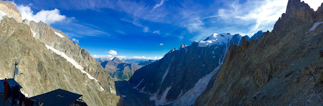 Odottamattoman lepopäivän käytimme nousemalla hissillä Aiguille du Midin huipulle (3842 m). Aikaa oli liian vähän, jotta noususta olisi ollut hyötyä akklimatisoitumisen näkökulmasta. Mutta en ollut aiemmin käynyt tuolla kuuluisalla huipulla, jonne yleensä Chamonix’iin saapuvat säntäävät ensimmäisenä, joten tartuin hanakasti tilaisuuteen päästä ihailemaan maisemia korkealta. Hissimatkan aikana maisema paljasti, että lunta oli todellakin paljon, ja saatoimme tässä kohtaa vain arvailla, mitä se tarkoittaisi kiipeämisellemme.