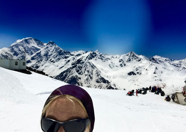 Kahden hissikyydin jälkeen olimme hiukan yli 3400 metrin korkeudessa merenpinnasta. Lumi narskui kenkien alla, ja kuuma aurinko helotti niin voimakkaana, että ilman aurinkolaseja oli mahdotonta olla. Nyt venäläisten paksussa aurinkorasvakerroksessa alkoi tuntua olevan jujua. Silmätulehduksesta johtuen olin edelleen ilman piilolinssejä, mutta olin jo sen verran tottunut alentuneeseen näkökykyyn, että päätin olla mahdollisimman pitkään ilman piilolinssejä. Ehkäpä siten saisin silmät kuntoon huiputusyritykseen mennessä.