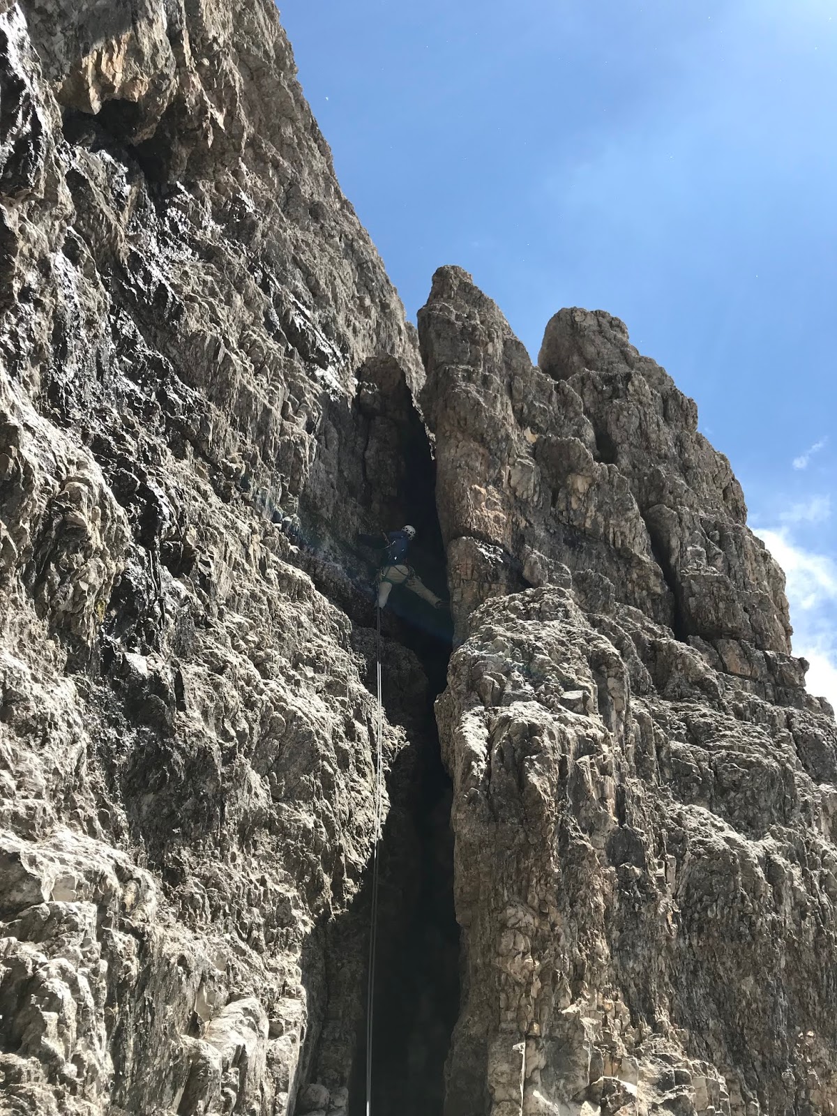 Tavoitteemme oli laskeutua uutta reittiä alas. Tällöin ensimmäisenä laskeutuvan tulisi aina löytää seuraavat kiinteät ankkuripaikat kalliosta. Mutta valitettavasti vuorotellen laskeutuessamme, Heikki ja minä emme ehkä olleet ihan harjaantuneimpia mahdollisia bongaamaan ankkuripaikkoja. Siksi useampaan otteeseen tulimme huomaamattamme laskeutuneeksi aivan köyden loppuun asti. Varma liukumavaran loppumisen merkki oli italialaisella aksentilla yläpuolelta karjuttu: