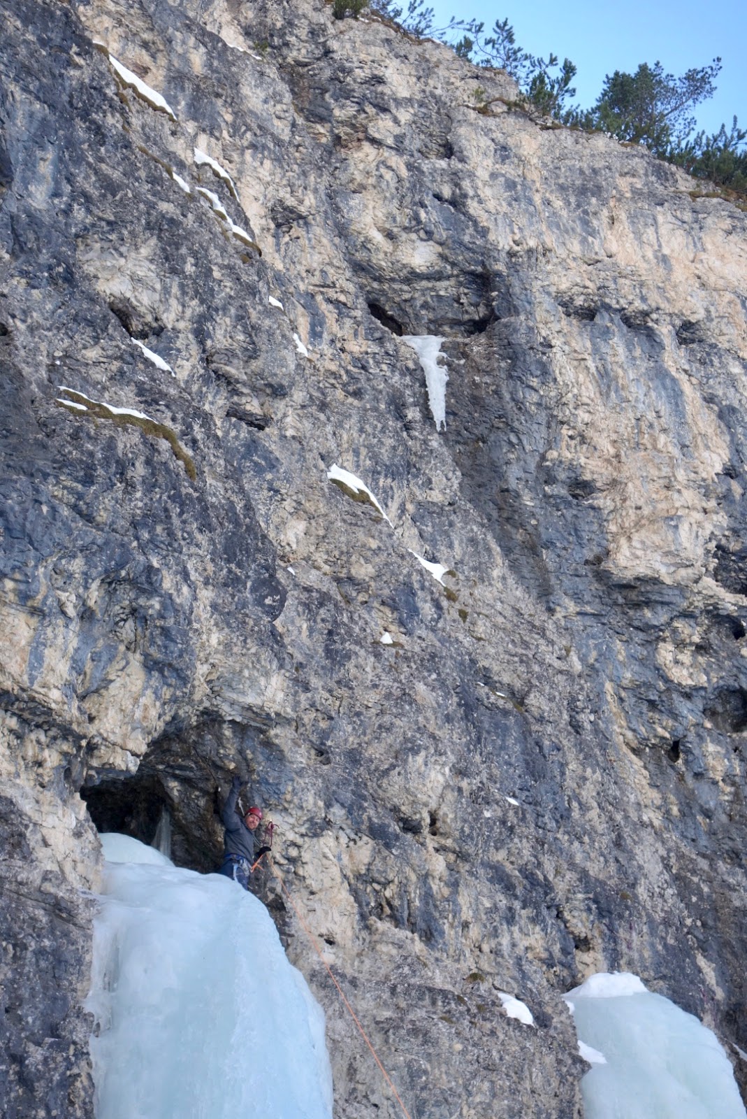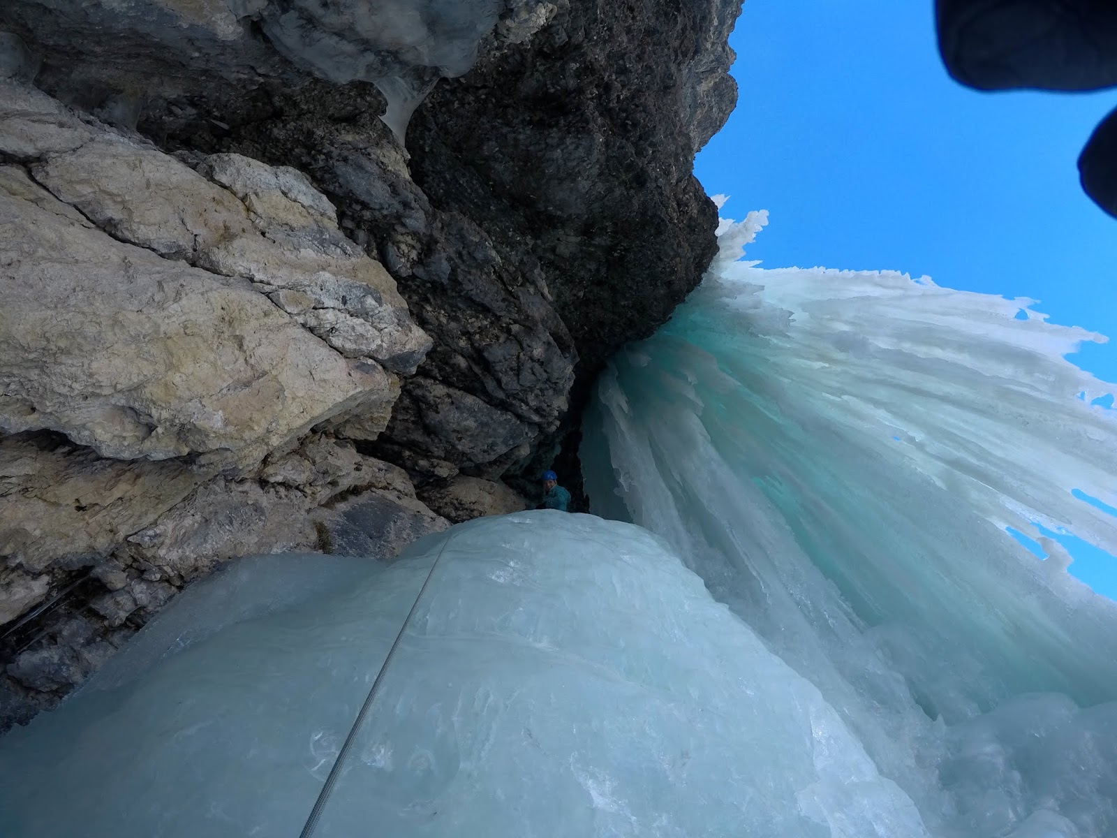 Viimein oli minun vuoroni, ja nousin seinälle. Kohdan kourumainen rakenne helpotti etenemistä, sillä levittämällä jalat kourun reunoja vasten voi pingottaa kehon yllättävän rennosti kourun keskikohdalle. Mutta se, mikä oli näyttänyt lähes tasaisilta jääaskelmilta ylös, paljastui nyt petollisen heikoksi jääksi, ja sain tosissani tehdä töitä löytääkseni kunnon pitävät otteet jäästä. Muutaman metrin jälkeen huomasin myös unohtaneeni kiristää kiipeilykengät ennen seinälle nousua – voin vakuuttaa, että se on virhe, joka kostautuu nopeasti ja kuumottavasti!