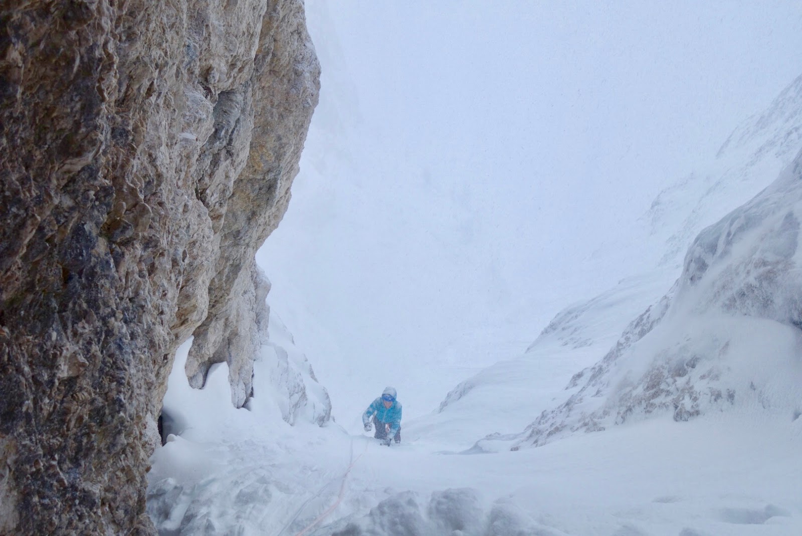 Jännitys kohisi suonissa samaa tahtia nilkoissani pyörteilevän valkoisen joen kanssa. Yläpuoleltani kourun reunalta satoi jatkuvasti lisää lunta niskaani. Kuitenkin reitilläni kourun laidassa valuva virtaus oli enemmänkin tuulen ja kourun keskivaiheilla kulkevan, isomman virtauksen voimasta pöllyävää vaahtoa – ei mukaansa tempaavaa massaa – joten tunsin tilanteen olevan hallinnassa. Lumen liike kuitenkin tempoi laskeutumisköysiä, ja koska valkoinen joki oli peittänyt alleen jääpinnan, askelissaan sai olla tarkkana, ettei kaatuisi.