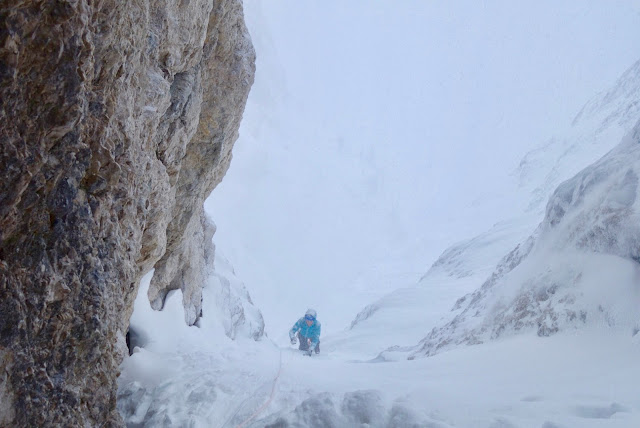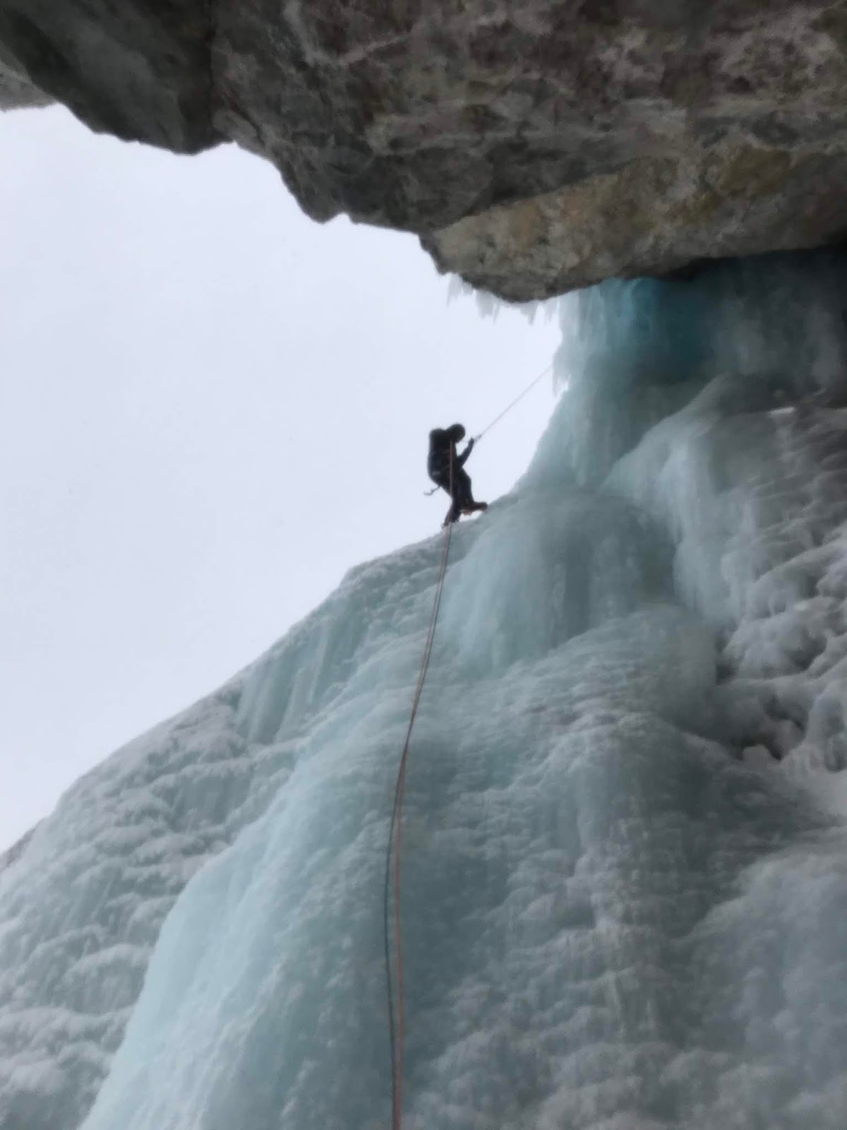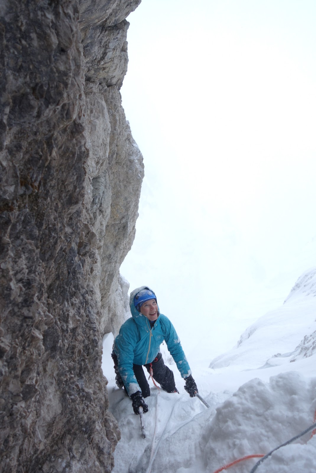 Kolmannen reitin alussa kiipesimme välietappina toimineesta jääluolasta lumimyräkkään pitkin jääseinää, jota pitkin solisi vesi: käytännössä miltei konttasin jäisessä purossa hurjassa viimassa. Työntyessäni ylös vetistä seinää kohti lumimyteriä, en voinut olla miettimättä, millaisen vaatimustason tämä asetti varusteidemme veden- ja tuulenpitävyydelle: kumman tahansa ominaisuuden pettäessä kiipeilijän olotila muuttuisi nopeasti erittäin vaikeaksi!