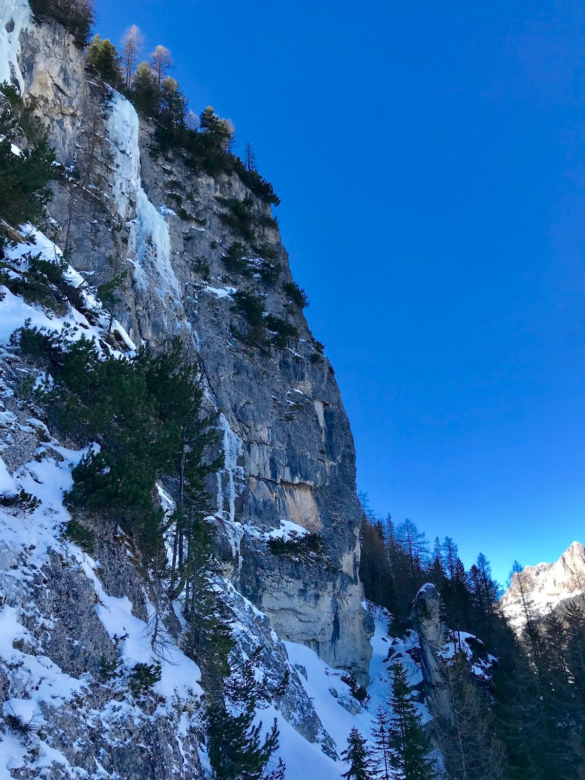 Olin yksin. Vuoren seinällä kaukana puiden yläpuolella. Katselin, kuinka alhaalla, metsän takana ihmiset laskettelivat rinnettä alas suksilla ja lumilaudoilla ja menivät sitten ehkä kaakaolle rinneravintolaan. Tai ehkä jäivät terassille nautiskelemaan kasvoihin osuvista auringonsäteistä. Ehkäpä he vilkaisivat varjoisella vuorenseinällä itseoikeutettuna lepäävää La Spada di Damoclen mahtipontista kärjellään seisovaa kolmiota. Tietämättä, että täällä, miekan terän keskivaiheilla, reilun kymmenen sentin levyisellä jäähyllyllä, seisoi nainen, joka juuri sillä hetkellä koki olevansa kuin toisessa universumissa. Yksin.