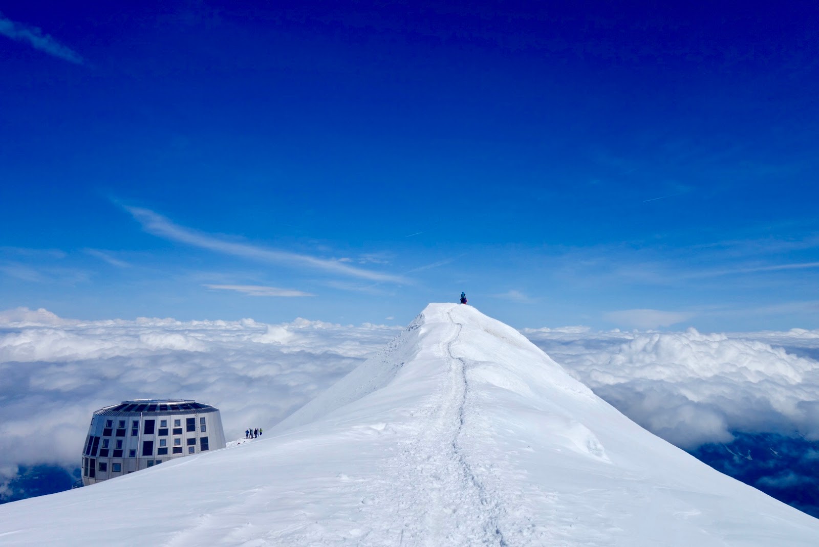 | Paluumatkalla Mont Blancin huipulta, keväällä 2018 (vasemmalla Gouterin maja) |