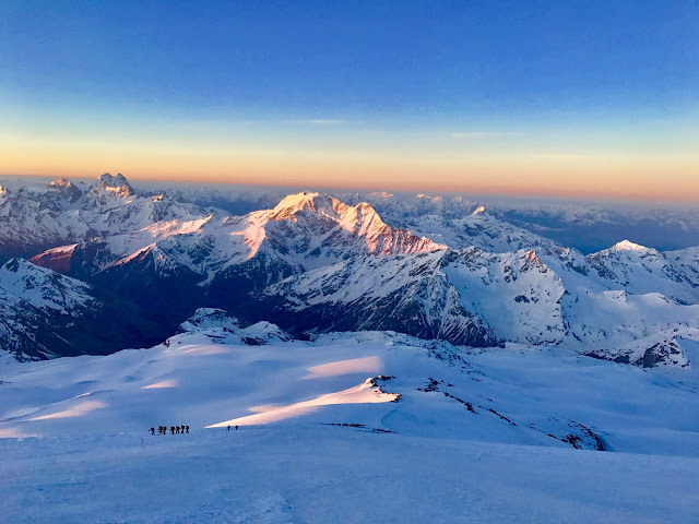 Vielä lyhyt jyrkkä nousu ja sen jälkeen siirryimme Elbrusin eteläisen huipun (joka on vain noin 20 metriä läntistä huippua matalampi) varjosta vuoren poikki kohti satulaa kulkevalle traverselle. Traversen maisema on huikaiseva: todellinen Kaukasuksen panorama. Ympäröivät vuoret ja pilvet olivat selvästi alempana ja esiin noussut aurinko sai maiseman hohtamaan niin kauniina, että oli lähes mahdotonta uskoa, että olin oikeasti keskellä näin valtavaa kauneutta. Aurinko alkoi lämmittää selkää mutta viimainen vuorituuli varmisti, ettemme voineet luopua paksuista toppavaatteista ja kasvoja suojaavista maskeista.
